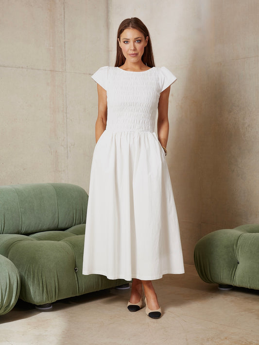 'ELIZABETH' SHIRRED BODICE SHORT SLEEVE MIDAXI DRESS WHITE