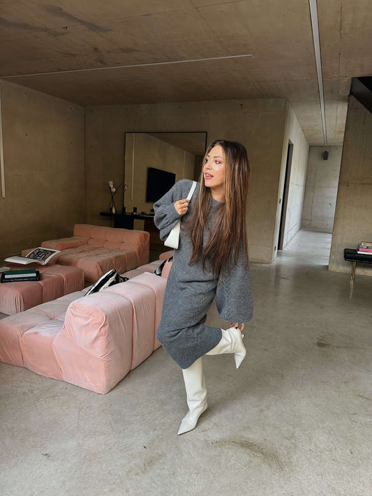‘MARGAUX’ KNITTED CABLE DETAIL BALLOON SLEEVE MIDI DRESS GREY