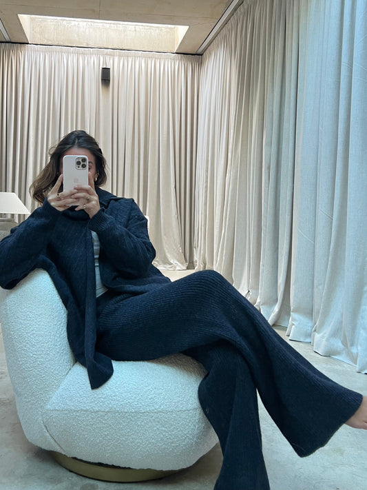 'CAMILLE' RIBBED DETAIL KNITTED WIDE LEG TROUSERS NAVY