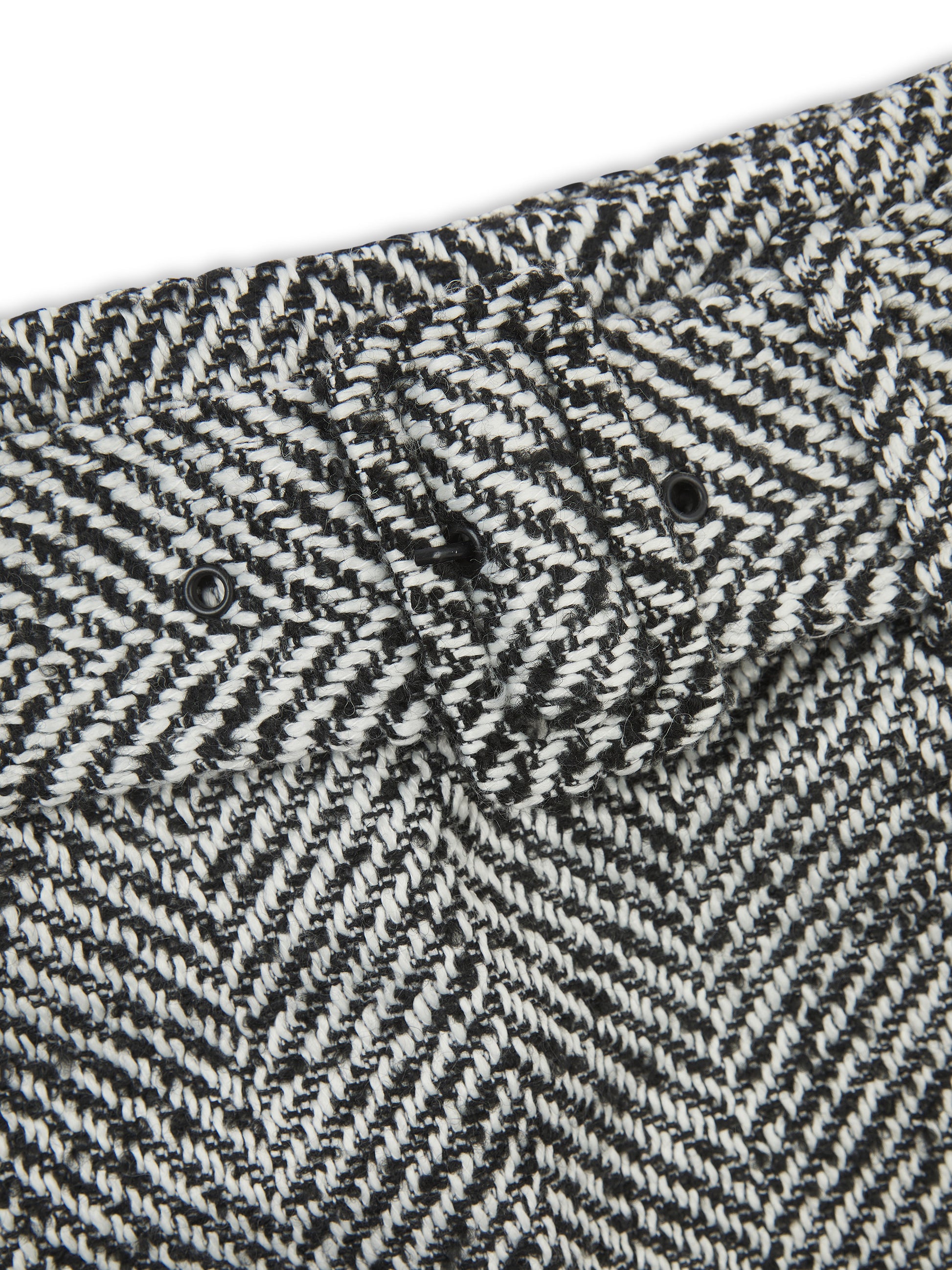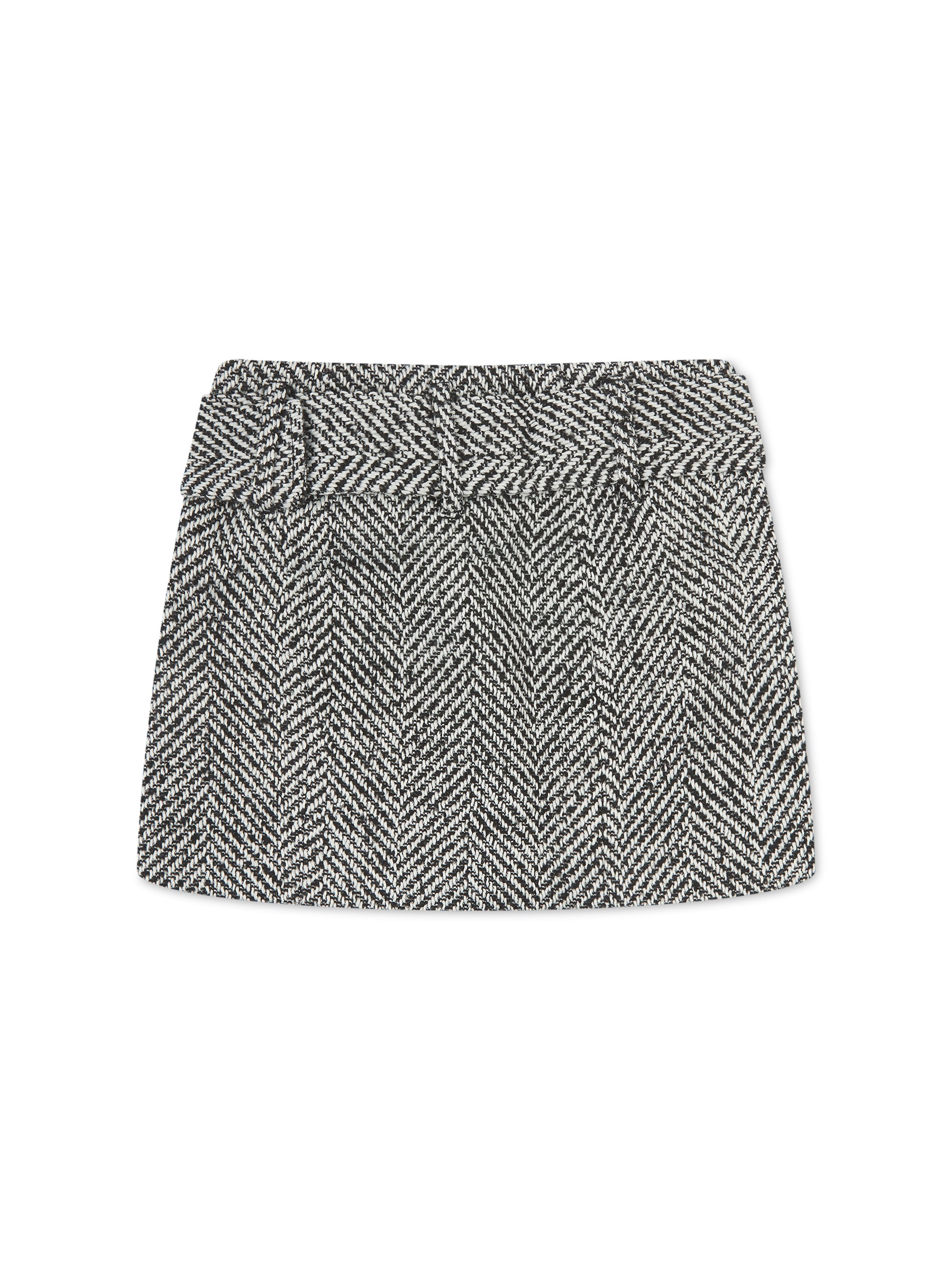 Introducing our brand-new herringbone A-line mini skirt. A high waist style with an A-line silhouette, featuring a buckle belt design, and side zip closure.