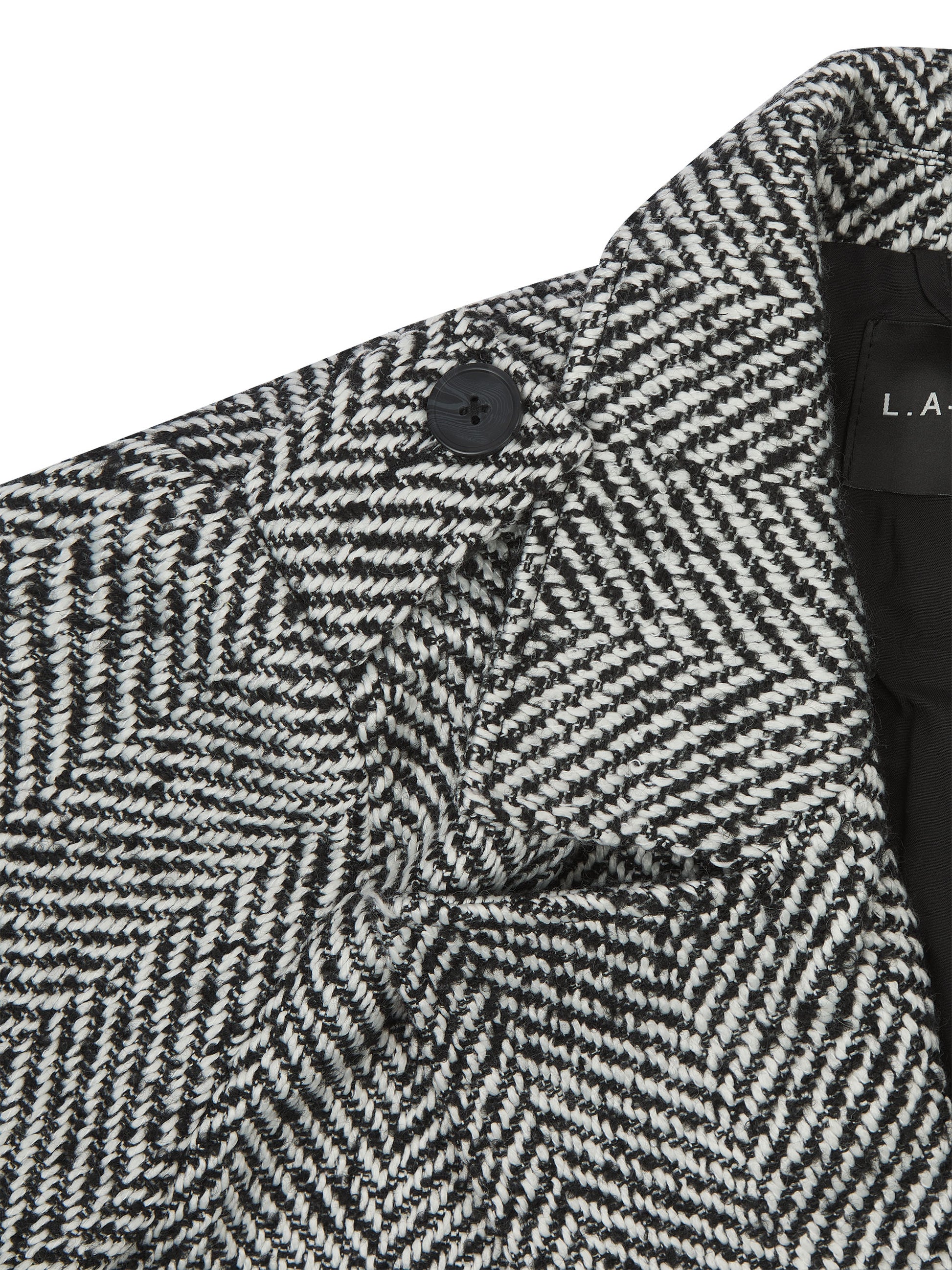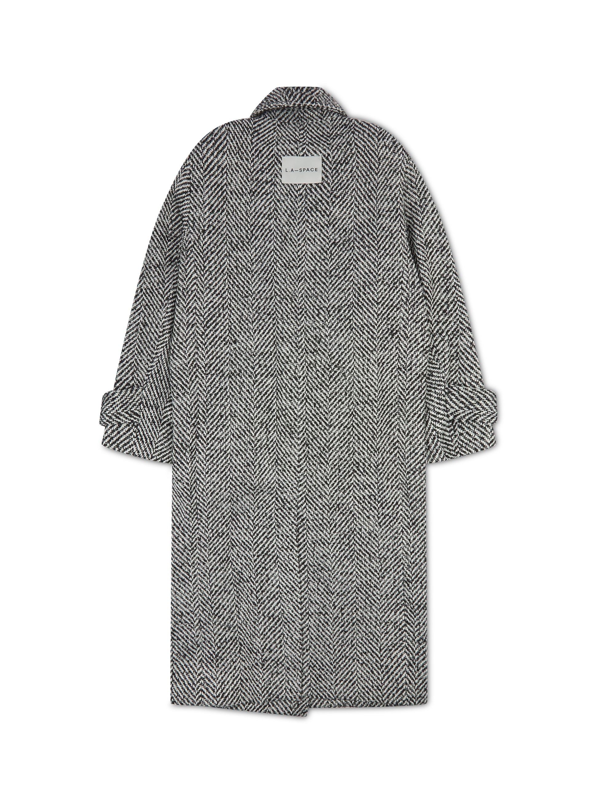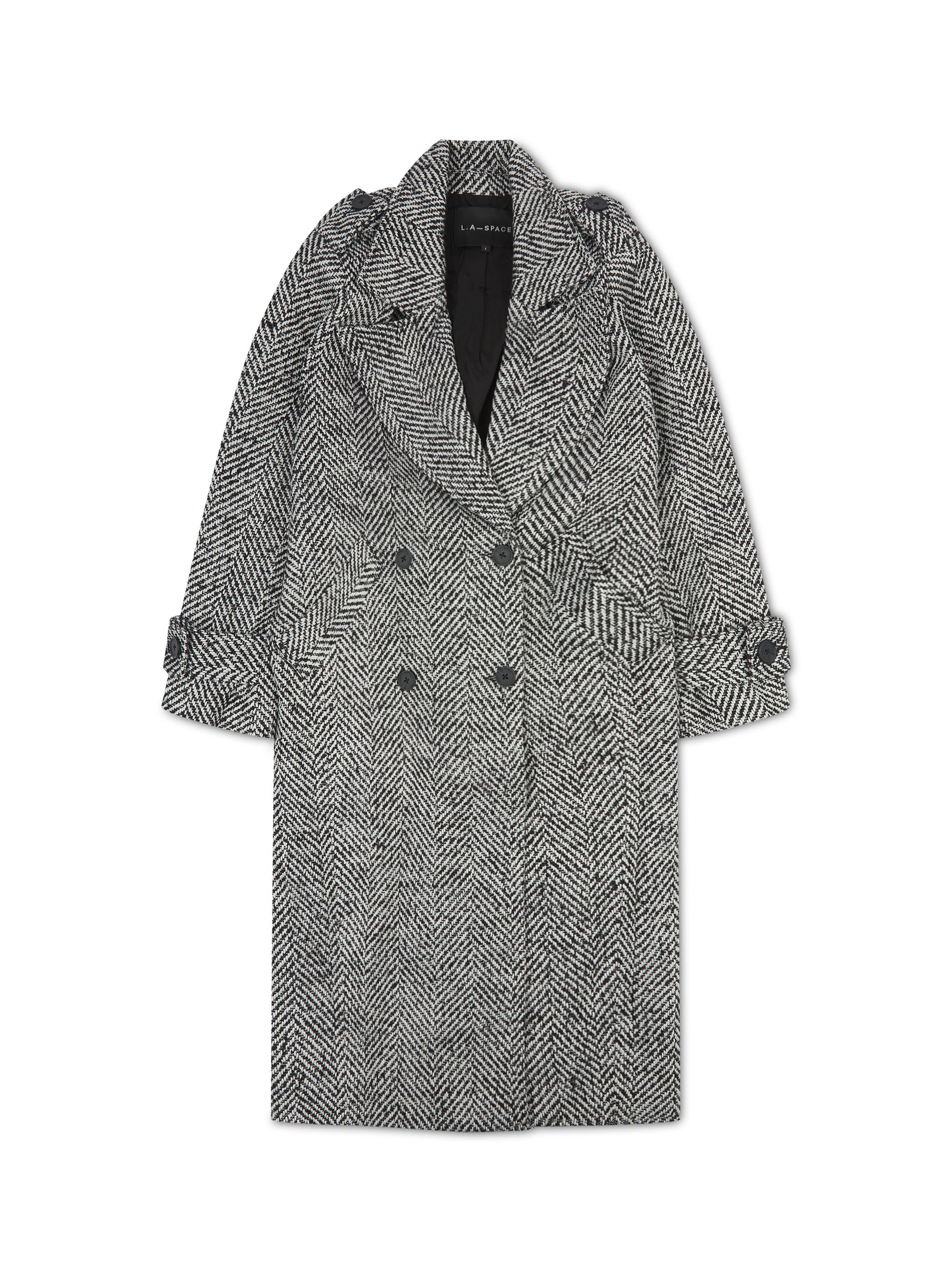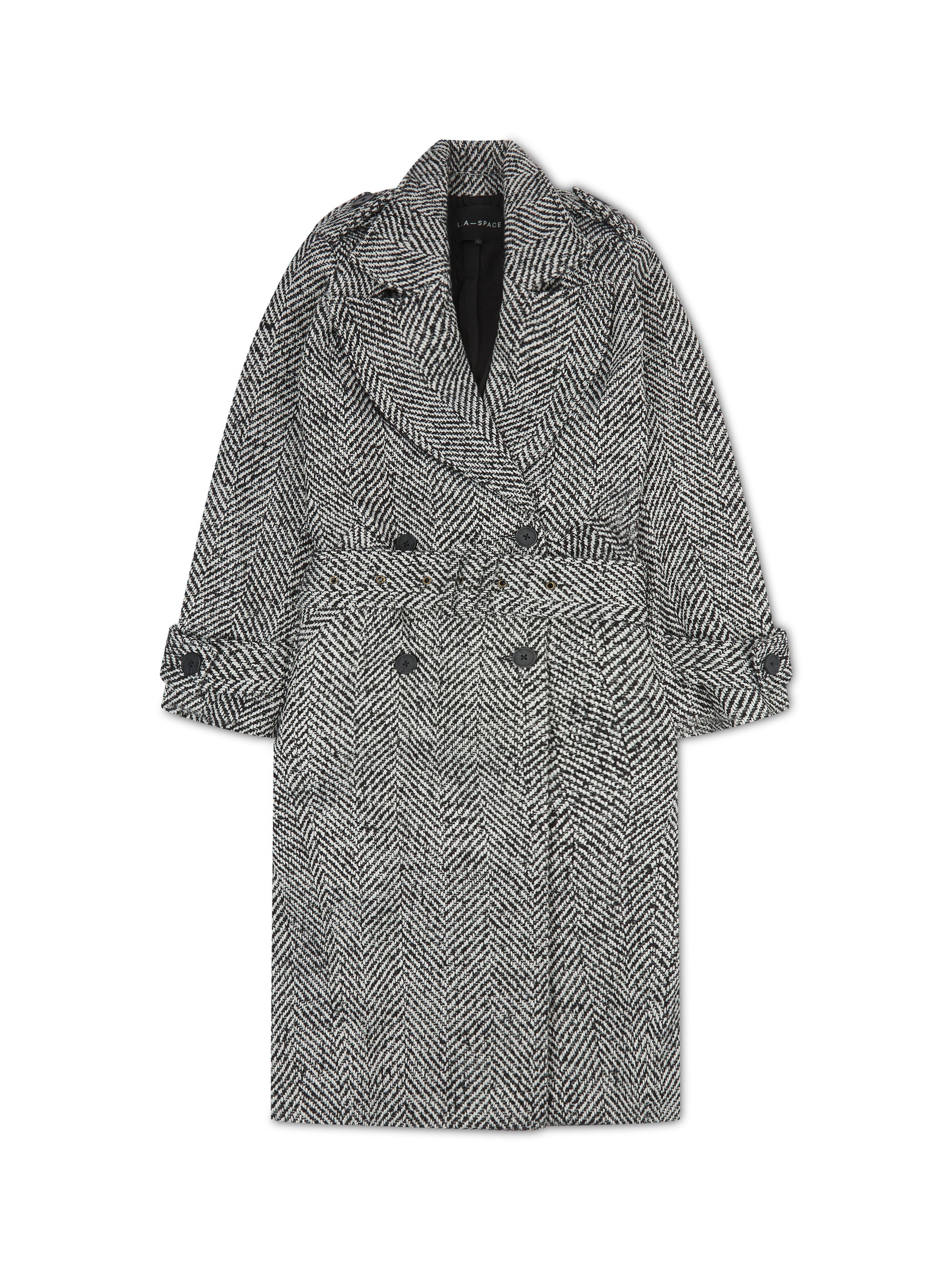 Our bestselling herringbone double breasted coat is back and updated, she now comes with a belt. Cut for a relaxed longline fit, this heavy-weight coat has been tailored with power shoulders, notch lapels, slanted side pockets, and epaulettes on the shoulders and cuffs.