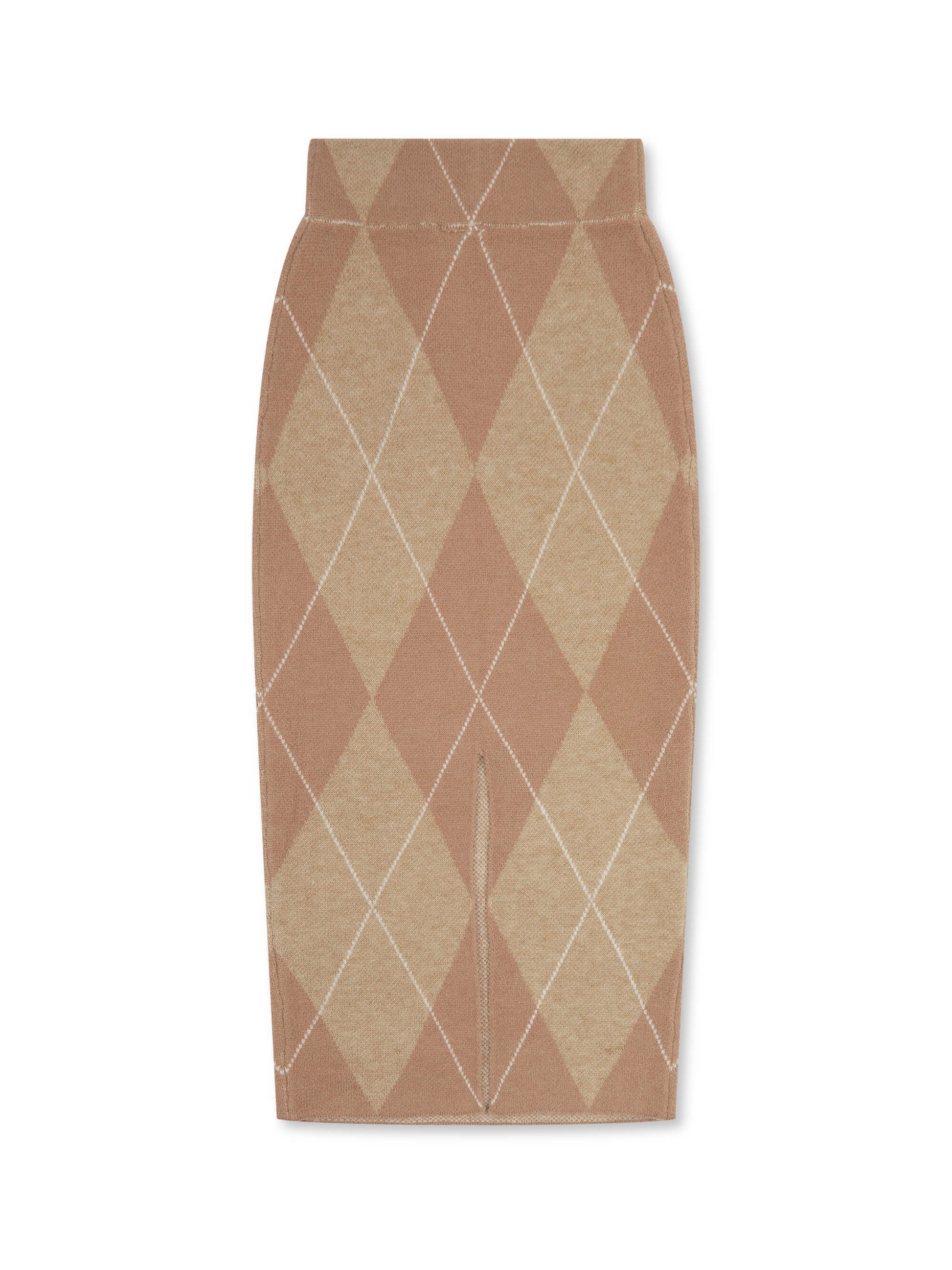 Elevate your everyday wardrobe with our midi-length 'Picture Perfect' Argyle Diamond Knit Column Skirt in tonal camel beige. Crafted in soft, comfortable knit, it features an elasticated waistband for a flattering fit and a centre back split for graceful movement.