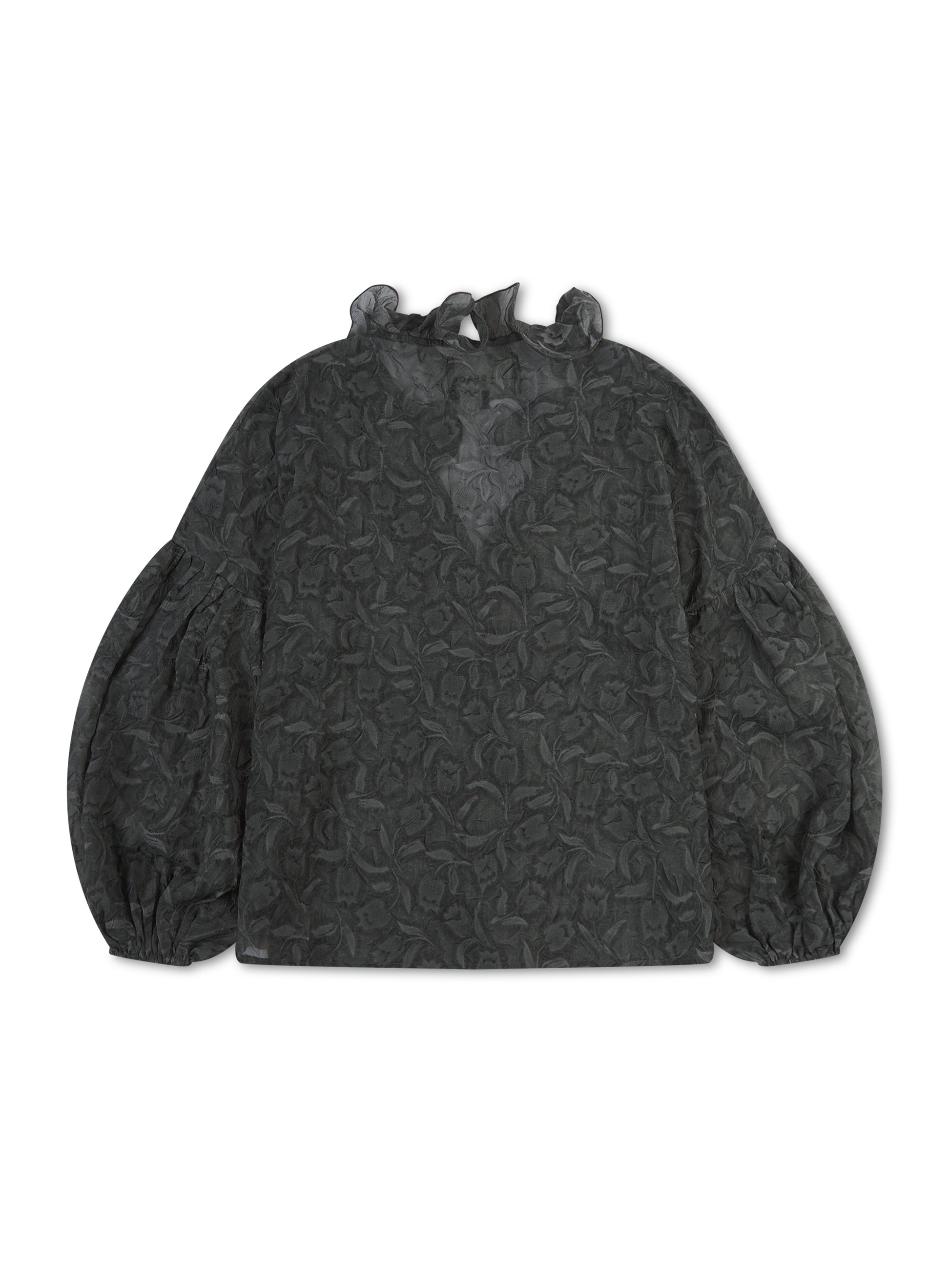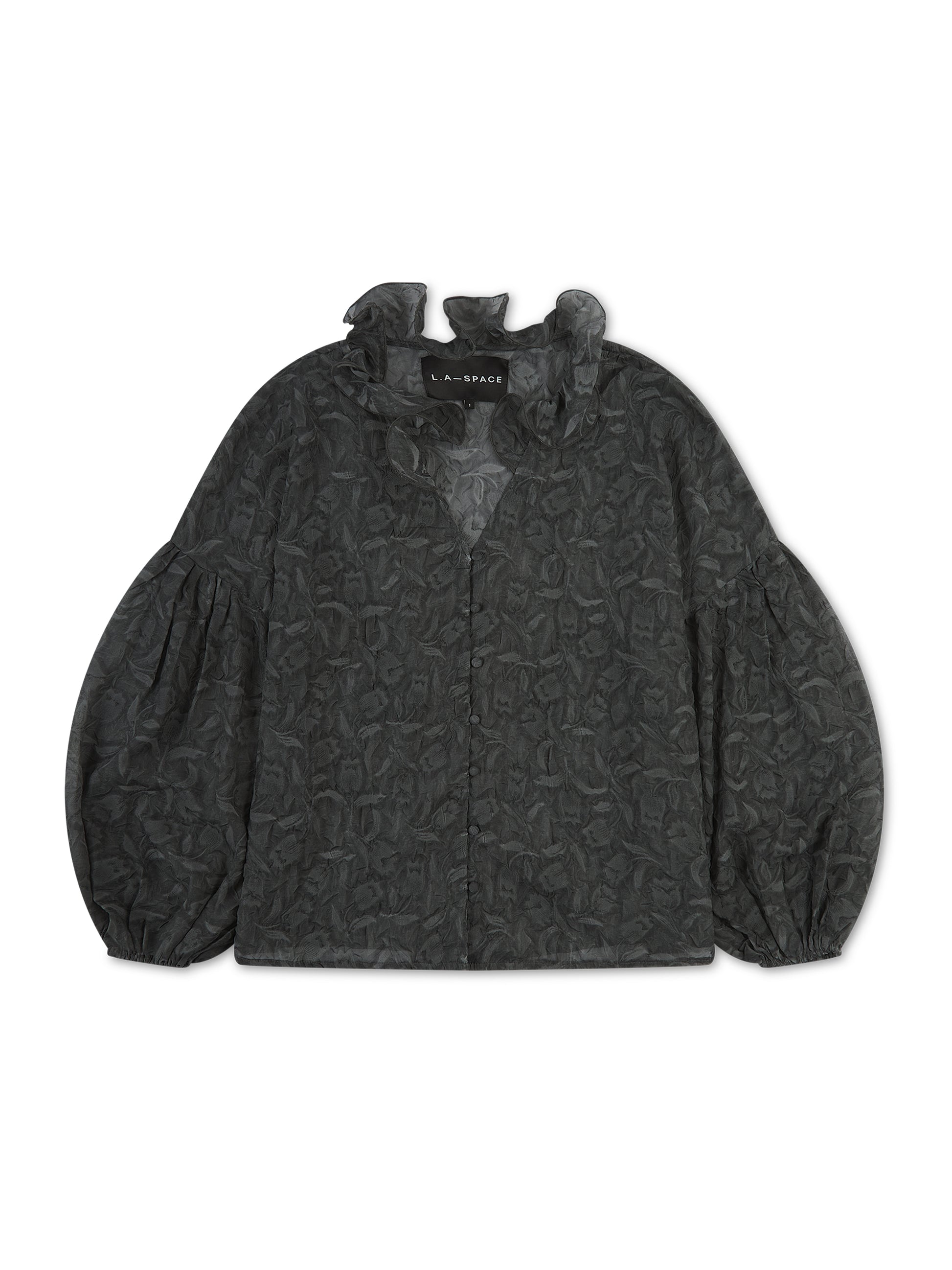 Our sheer jacquard blouse features a dropped shoulder, exaggerated blouson sleeves and is complete with ruffle detailing along the neckline. Wear it layered, tucked, or loose – this blouse will take you effortlessly from day to night. Style with our ‘Coucou Lace Bralette’ and ‘Contouring Leggings’.